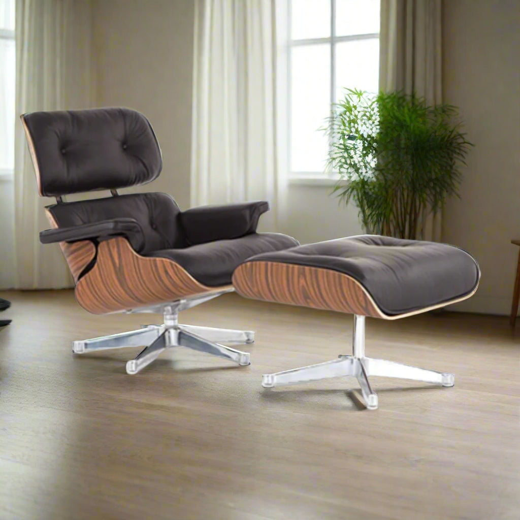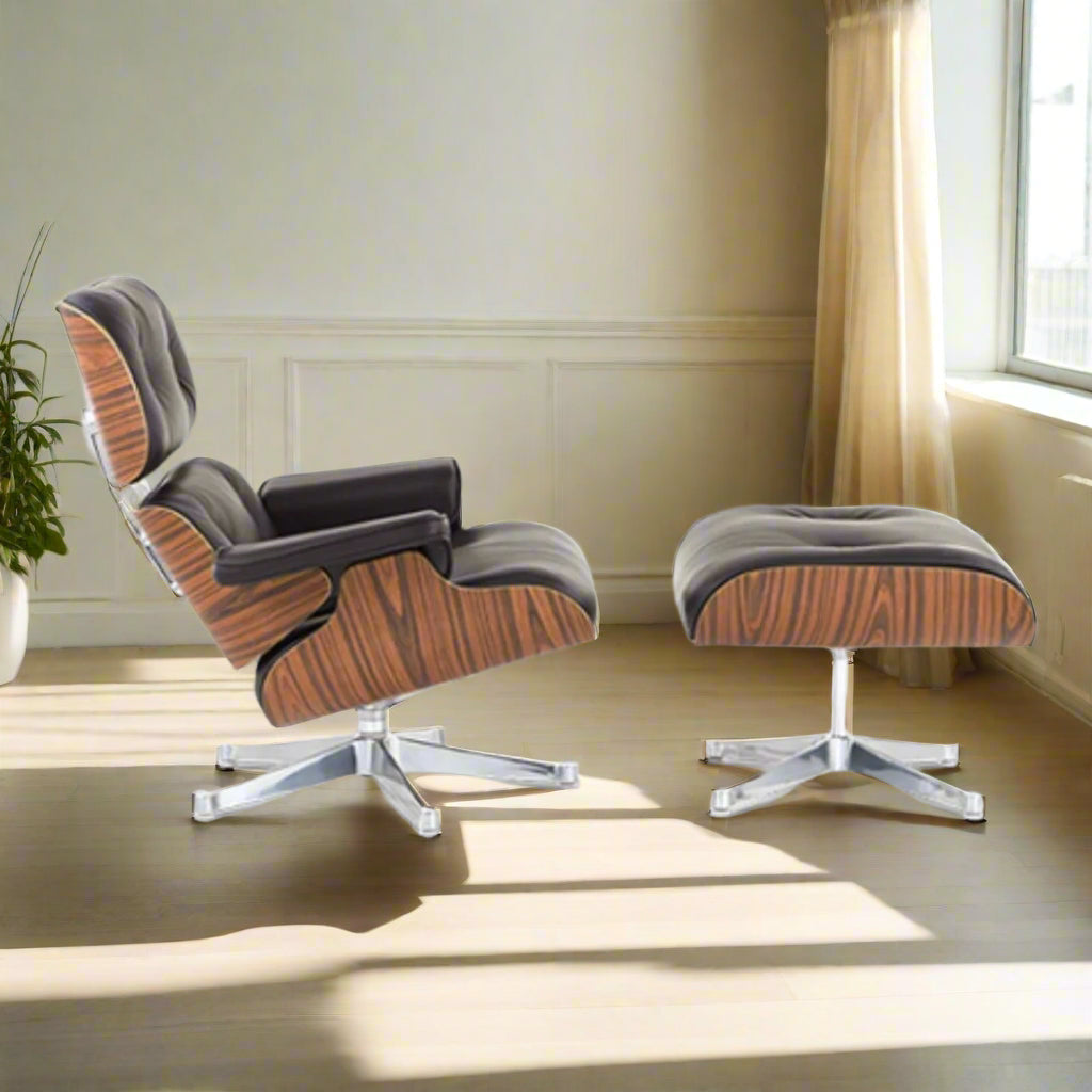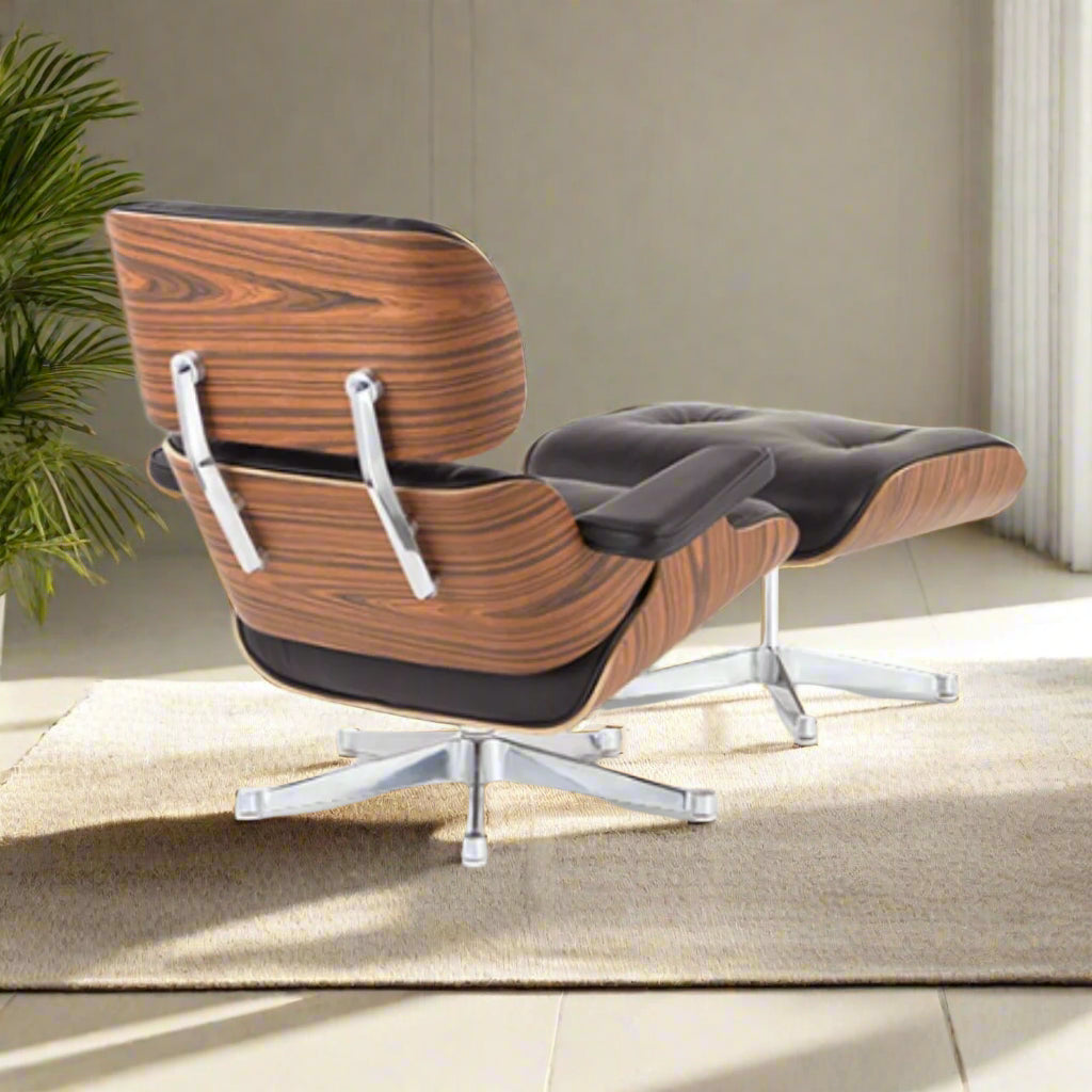 Charles Eames Style Lounge Chair with Ottoman | Black Waxed Leather | Rose Wood