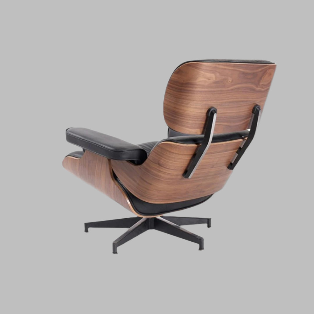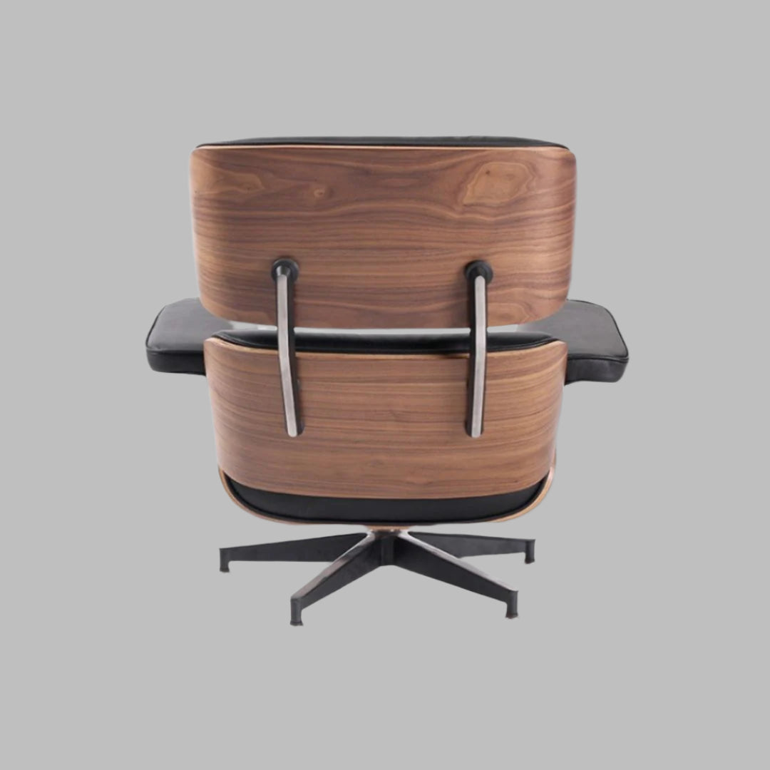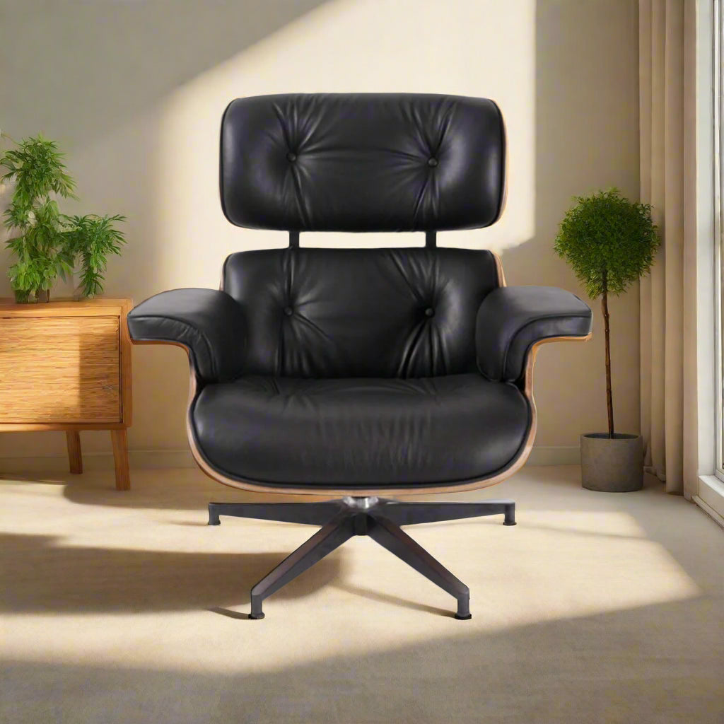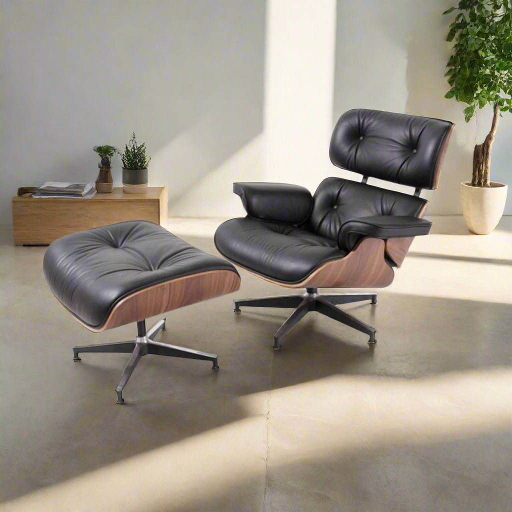 Charles Eames Style Lounge Chair with Ottoman | Black Waxed Leather | Walnut Wood