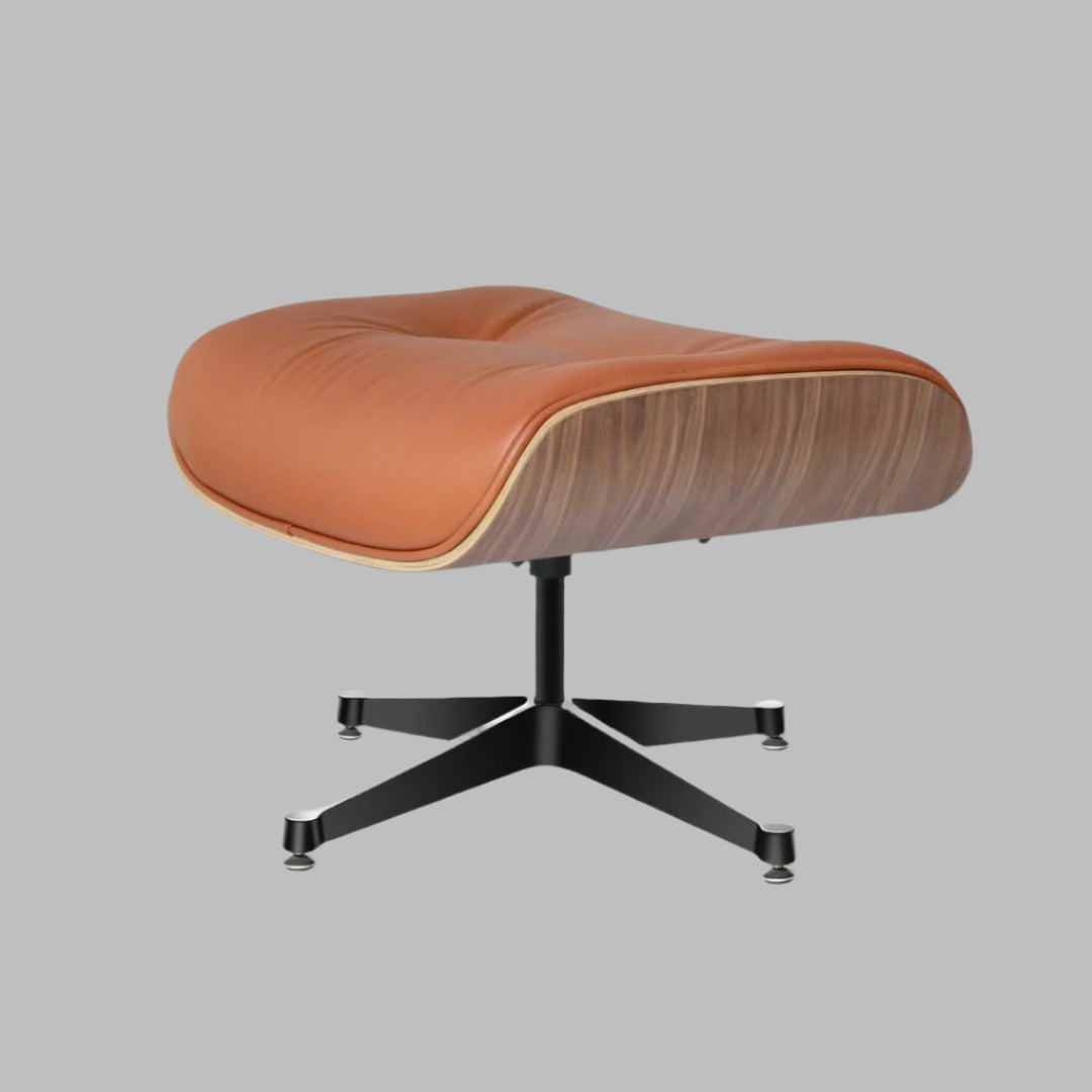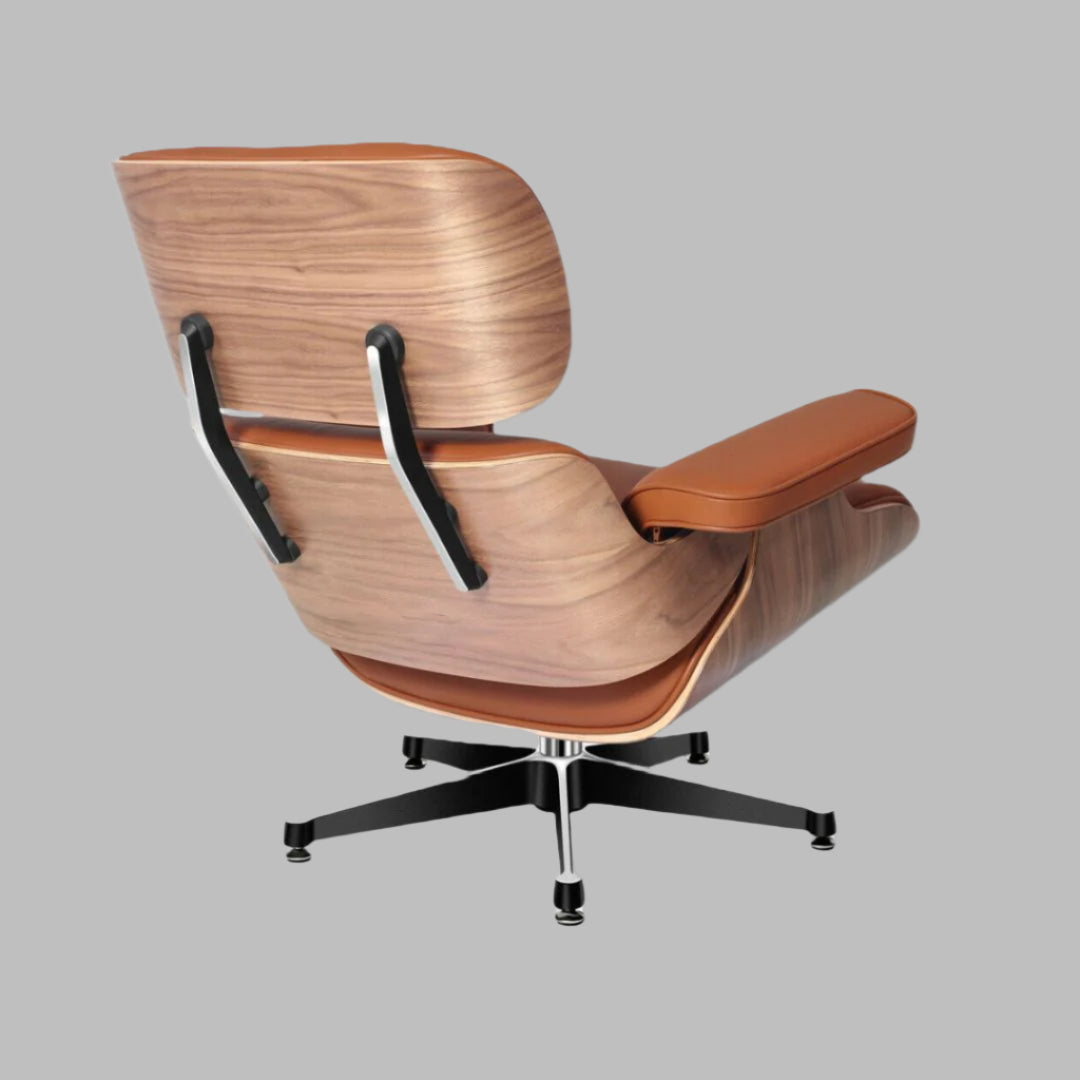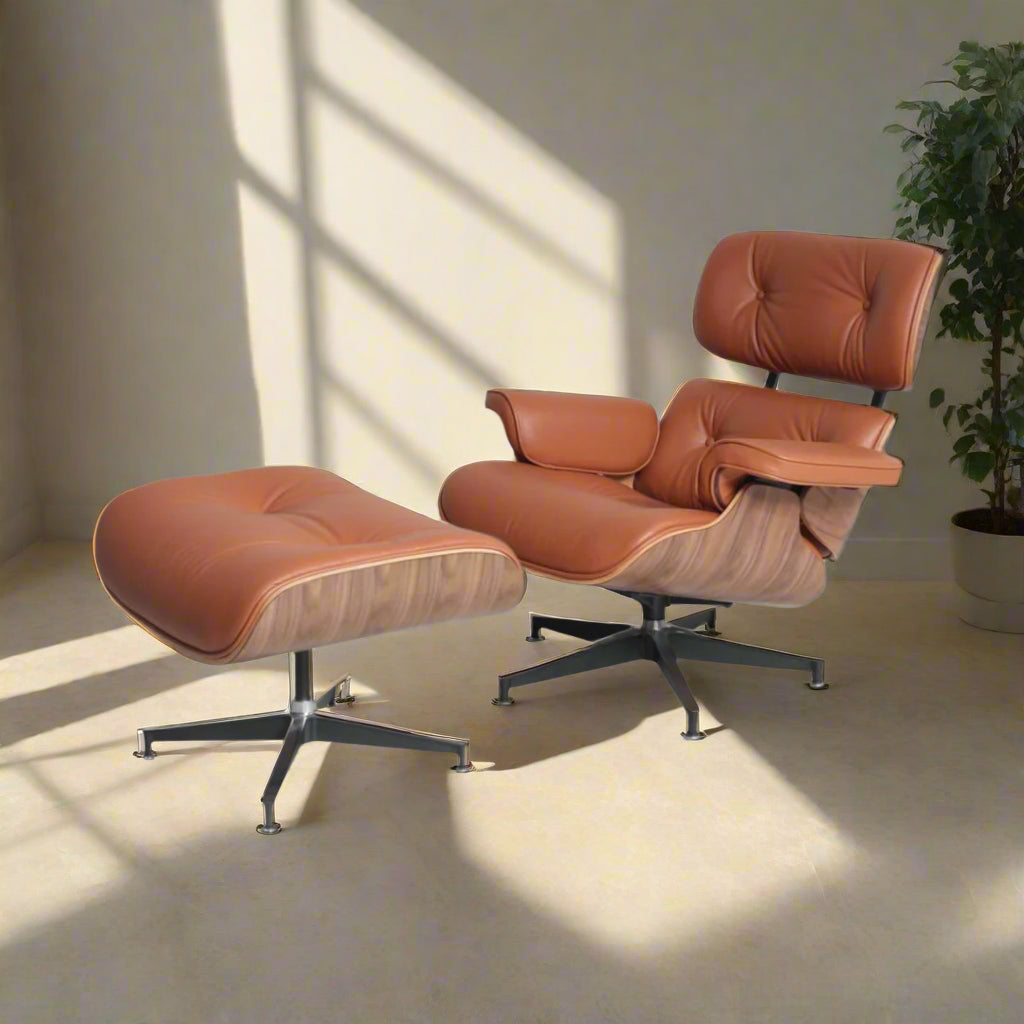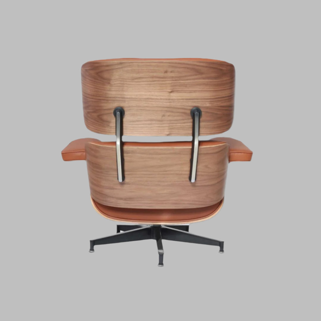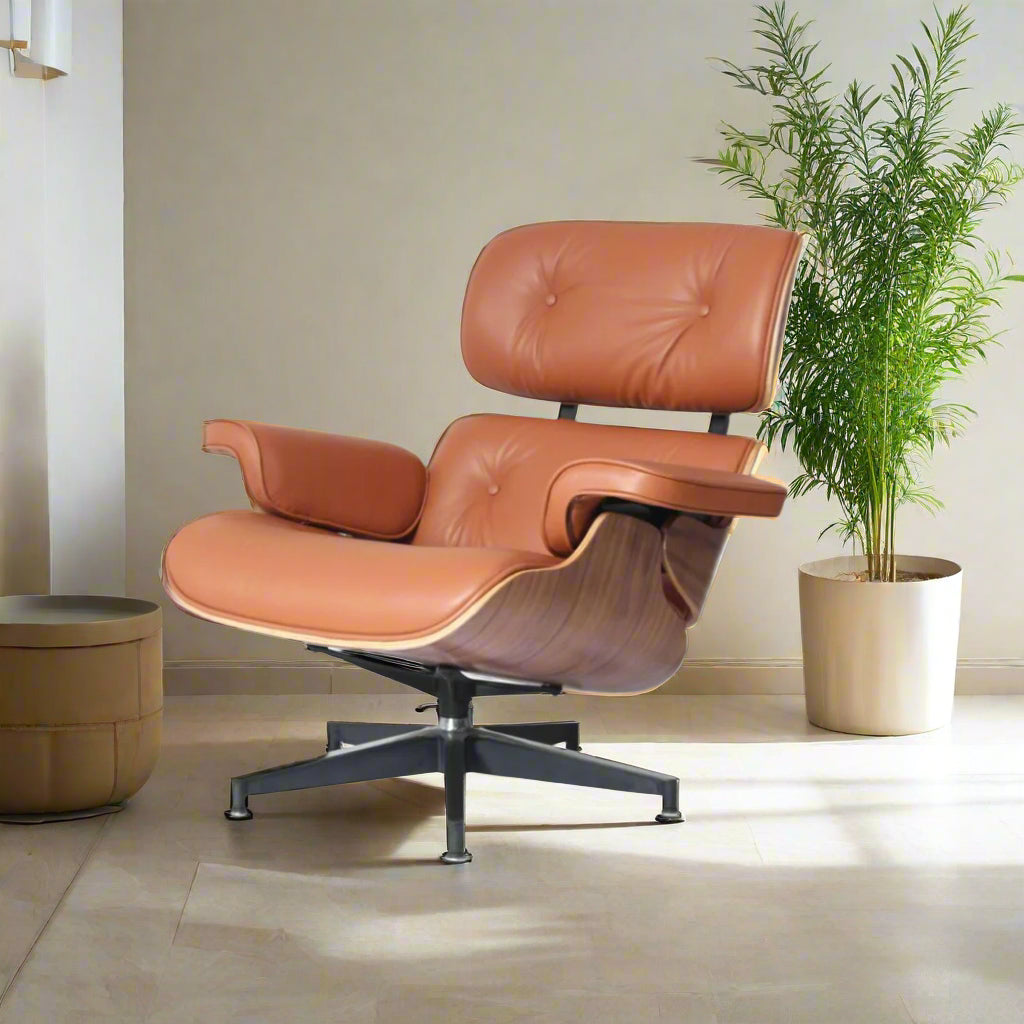 The chair is thoughtfully designed for ultimate relaxation, featuring a reclined posture and swiveling base. The accompanying ottoman provides perfect support for your legs, completing this iconic ensemble. An investment in both style and comfort, our Charles Eames Style Lounge Chair and Ottoman in tan brown offers a sanctuary of relaxation and a statement of enduring design.